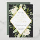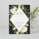 Nuestra invitación a la boda de Marfil Bloom rodea los detalles del día de la boda con un marco geométrico moderno en forma de diamante de color de agua pintada, hojas de eucalipto, follaje botánico y flores blancas de rosa y peonía. El recorte de Relieve metalizado dorado y las letras de acento añaden un acabado de lujo a este hermoso diseño.
