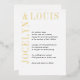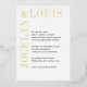 Invitación a una boda moderna de Relieve metalizado dorado con un diseño minimalista con sus nombres en una fuente grande a lo largo del lado izquierdo y superior. Sus nombres están en Relieve metalizado real y todo el texto de la parte delantera se puede cambiar a Relieve metalizado en la herramienta de edición de diseño. La espalda tiene su monograma. Este diseño es lo suficientemente sencillo para un boda formal, pero hace una declaración audaz.