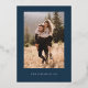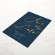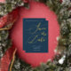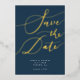 Elegante guardar la tarjeta de fecha con un texto de caligrafía con letras a mano que dice "guardar la fecha" en oro sobre un fondo azul marino. Puede añadir una foto en la parte posterior.