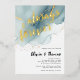 Una plantilla de invitación a bodas con temática playera que presenta una escena acuarela abstracta pintada de una playa y olas con efecto colgante de tinta dorada (¡el oro es un efecto digital, no un Relieve metalizado real!) y caligrafía moderna con el título "siempre y para siempre" en Relieve metalizado de oro real. Elegante y elegante, sencillo y moderno, es una opción agradable para una boda playera en cualquier temporada, para una pareja moderna.