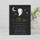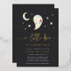 Celebra tu espeluznante ducha de bebé de temporada con estilo con esta encantadora invitación al Relieve metalizado de oro. Con una letra a mano "A Little Boo is Casi Due" (Un pequeño boo es casi debido) en un Relieve metalizado de lujo, un ilustracion fantasma dulce, y un fondo de carbón profundo repartido con estrellas y una luna creciente, esta tarjeta es una mezcla perfecta de juguetón y elegancia. Ideal para las duchas de otoño o de Halloween, está impreso en el material de Relieve metalizado premium con letras brillantes que le dan un toque mágico a su evento. Personaliza todos los detalles para que sea tu propio.