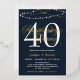 Invitación para la fiesta de cena de aniversario de bodas 40 en azul marino con detalles de foil blanco y dorado. Invitación para la cena de aniversario con luces de cadenas sin foto con los años que han estado casados en una fuente blanca y sus nombres en foil dorado. Invitación elegante para la cena de aniversario de bodas cuadragésimo personalizada con sus nombres en foil dorado contra un fondo azul marino.