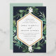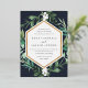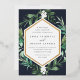 Escoja estas invitaciones botánicas de bodas ricamente coloreadas para elegantes bodas de invierno, nupcias de otoño o otoño, o bodas nocturnos en verano. El diseño de la moda combina elementos naturales y geométricos para un aspecto fresco y moderno. Los detalles de tu boda aparecen en ricas letras en negro sobre un elemento geométrico blanco con un borde de Relieve metalizado dorado, rodeado de follaje verde, hojas exuberantes y flores blancas pequeñas. Un fondo azul marino profundo añade riqueza y drama. Artículos coincidentes disponibles en nuestra colección de Greenhouse.