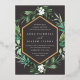 Escoja estas invitaciones botánicas de bodas ricamente coloreadas para elegantes bodas de invierno, nupcias de otoño o otoño, o bodas nocturnos en verano. El diseño de la moda combina elementos naturales y geométricos para un aspecto fresco y moderno. Los detalles de su boda aparecen con letras blancas, enmarcadas por un borde de Relieve metalizado dorado y rodeadas de follaje verde, hojas exuberantes y flores blancas pequeñas. Artículos coincidentes disponibles en nuestra colección de Greenhouse.