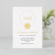 Esta elegante invitación a la boda tiene un fondo blanco con acentos de Relieve metalizado dorado y elementos florales. Sus iniciales se muestran en un hermoso tipo de letra dentro de un marco que se parece a un estrangulador de alambre, con una flor en un extremo. La parte trasera de la invitación tiene un patrón diagonal de los nombres de la pareja en oro sobre blanco para mayor sofisticación.