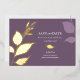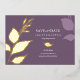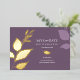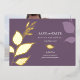 Boda botánica única ahorra la fecha de la invitación marcos los detalles de tu invitación con un borde de elegantes hojas de otoño de Relieve metalizado dorado. Los detalles de la fecha se guardan en un elegante tipo tradicional serif sobre un sólido fondo de ciruela morada. La tarjeta vuelve a la foto de compromiso. Perfecto para el otoño, bodas de temática rústica o ajardinada en septiembre, octubre y noviembre. Para ver más diseños como esta visita Do Tell A Belle on Zazzle en www.zazzle.com/dotellabelle