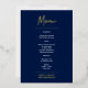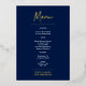 Esta tarjeta de menú moderna presenta un auténtico pincel dorado con escritura a mano y una disposición sencilla sobre un fondo azul marino. Esta tarjeta de menú añadirá un detalle elegante a la decoración de tu fiesta de cumpleaños. Puedes personalizar el texto y utilizarlo para cualquier cena. La invitación y suministros de fiesta a juego están disponibles en mi tienda BaraBomDesign.