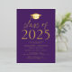 Invite a los huéspedes a celebrar el grado con nuestra moderna clase de invitados a la fiesta de graduación 2025. Las invitaciones presentan un tapón de graduación en la parte superior con la "Clase de 2025" mostrada en letras de Relieve metalizado dorado con fondo morado. Personalice las invitaciones agregando el nombre del graduado, la escuela y los detalles de la fiesta de graduación. La fiesta de graduación del Relieve metalizado de oro invita a revertir para mostrar la foto del graduado.