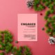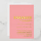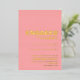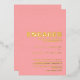 Invite a sus amigos y seres queridos a su fiesta de compromiso con esta moderna invitación rosa con un atrevido texto de Relieve metalizado dorado al frente de la invitación.