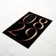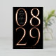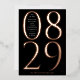 Esta tarjeta de fecha, moderna y audaz, permite guardar la fecha de su boda en números extra grandes en el tipo de Relieve metalizado oro rosa real sobre un fondo negro. Los nombres de la pareja y la ubicación del boda se muestran dentro del cero durante meses de enero a septiembre y a la izquierda del numeral durante meses de octubre a diciembre. Esta moda guardar la tarjeta de fecha hará una declaración y establecerá el tono para su boda. La parte posterior de guardar la fecha tiene espacio para una fotografía de página completa.