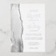 El borde izquierdo de esta elegante y moderna invitación a la boda incluye un borde de agujeros gris y blanco adornado con un falso purpurina de plata. El texto del personalizable combina la escritura a mano, el copperplate y los tipos de letra cursiva en Relieve metalizado plateado real sobre un fondo blanco. El reverso presenta un diseño de ágata gris, blanco y plateado.