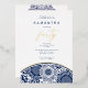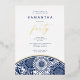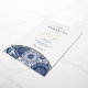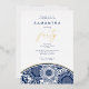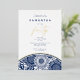 Una lujosa y moderna invitación al estilo chino, con un elegante fondo azul intenso, adornado con intrincados motivos de Relieve metalizado dorado inspirados en el arte tradicional chino.