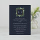 Nuestra invitación a una boda en un monograma de Greenhouse incluye sus iniciales, monograma o duograma en la parte superior, enclavado dentro de una corona cuadrada de follaje color agua verde, hojas botánicas y pequeñas flores blancas en un rico fondo azul marino con guarnecido de Relieve metalizado dorado. Una visión moderna de la tendencia botánica para bodas de invierno, otoño romántico o nupcias de otoño, o elegantes bodas nocturnos de verano.