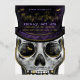 Diseño de la invitación al Relieve metalizado real de la fiesta de Halloween con temática de Skeleton. El diseño presenta nuestro propio ilustracion hecho a mano de una vista de cerca de un monstruo de Skeleton con un sombrerete morado oscuro. "Monster Bash" se muestra en un elegante guión de un cepillo escrito a mano en blanco con los detalles de la fiesta de Halloween mostrados sobre el esqueleto artístico para crear un diseño de invitación de fiesta de Halloween audaz y único. El reverso presenta un diseño rústico de rayas negras y violetas. Todos los ilustraciones contenidos en esta audaz invitación temática de Skeleton Halloween son obras de arte originales hechas a mano por Moodthology.