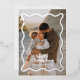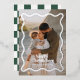Tarjeta de Navidad con foto real en hoja de aluminio y patrón gráfico minimalista moderno de verificación en verde. Diseño audaz y de moda. Parte de una colección de fiestas.
