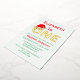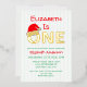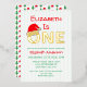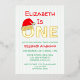 Navidades de primer cumpleaños con franjas sutiles. De vuelta de la invitación hay un patrón de árboles de Navidad y sombreros de santa