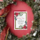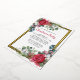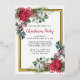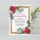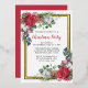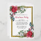 La elegante invitación a la fiesta para Navidades incluye dos estribillos florales decorando un marco de Relieve metalizado dorado. Las espirales tienen rosas rojas, flores de algodón blanco, cañas de caramelo, pino y vegetación holgada.