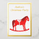 Esta hermosa invitación del Partido de Navidades de Relieve metalizado presenta una imagen de arte digital de un lindo caballo balancín de estilo escandinavo. El caballo es rojo con un mané rojo oscuro, cola y pezuñas. El caballo amistoso sonríe. Tiene una silla blanca y riendas con motivos folclóricos escandinavos bonitos en la silla, incluyendo el sol, la luna y las estrellas y los corazones y flores. La base del mecedor es roja y está cubierta de hojas blancas de bonito. El diseño se inspiró en el caballo Dala sueco. Hay texto personalizado en el frente en un hermoso Relieve metalizado de oro. Hay texto adicional en la parte posterior para que pueda incluir todos los detalles.