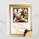 Bonita y elegante invitación a la boda con la imagen impresa de un hermoso boda floral. La novia y el novio están saltando sobre la escoba después de que el ministro dijera: "Ahora te declaro hombre y mujer". Una auténtica invitación al Relieve metalizado con colores dorados y blancos cremosos. En la esquina derecha hay una hermosa flor de hidrangea amarilla de color agua.