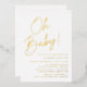 Sencillas invitaciones para una ducha de bebé con "Oh bebé" mostradas en un audaz guión de Relieve metalizado dorado con fondo blanco. Personalice las invitaciones minimalistas a la ducha con el nombre de la madre y los detalles de la ducha. Las invitaciones a la ducha de Relieve metalizado dorado se revierten para mostrar tu foto de embarazo y texto personalizado. ¡Las invitaciones son perfectas para las duchas de bebé sin distinción de género!