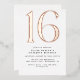 Invitaciones de 16 años de estilo moderno con un gran epígrafe "16" en Relieve metalizado metálico real. Relieve metalizado Rosa de oro sobre fondo blanco. (Los colores de fondo se pueden cambiar utilizando la herramienta de diseño. También puede cambiar el tipo de Relieve metalizado metálico.)