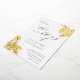Invite a los huéspedes a su boda de verano, destino o playa con estas invitaciones nupciales de moda tropical con hojas de palmeras tropicales en un elegante Relieve metalizado dorado. Los detalles de su boda aparecen en una combinación de escritura caligráfica, serif y tipografía cursiva. Las tarjetas cambian a verde tropical sólido.