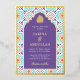 Sorprenda a sus invitados con esta elegante invitación de boda que presenta "Bismillah" en caligrafía árabe, en un hermoso fondo de tejas persas con elementos de Relieve metalizado de oro reales. Simplemente agregue los detalles de su evento en esta plantilla fácil de usar para convertirla en una invitación única.