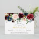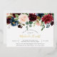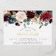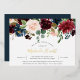 La invitación a la ducha de moda con flores de novia incluye un borde superior de burgundy marsala, flores rosas y azul marino, con frondosos follajes botánicos y vegetación. Personalice los detalles de su ducha de novia con letras escritas a mano y tradicionales sans serif. Invitaciones revertidas a azul marino rico. Los acentos de Relieve metalizado de oro de lujo le dan un toque especial a estas hermosas invitaciones a la ducha de novias.