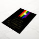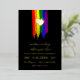 Encantadora invitación a una boda lgbt con la bandera del orgullo arcoiris dibujada con golpes desordenados y adornada con un corazón dorado contra un fondo negro con texto de Relieve metalizado dorado.