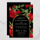 La disposición floral se sienta detrás de los detalles de la ceremonia boda encerrados por un arco para esta encantadora invitación a las flores rojas. El arco doble está en Relieve metalizado real (oro, plata u oro rosa). La parte trasera de la invitación es un pequeño arreglo floral sobre la fecha boda en texto blanco sobre un fondo negro.
