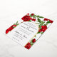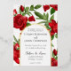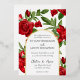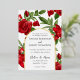 La disposición floral se sienta detrás de los detalles de la ceremonia boda encerrados por un arco para esta encantadora invitación a las flores rojas. El arco doble está en Relieve metalizado real (oro, plata u oro rosa). La parte trasera de la invitación es un pequeño arreglo floral sobre la fecha boda en texto negro sobre un fondo blanco.