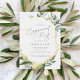 Las invitaciones a las fiestas de compromiso con el tema de la naturaleza son hermosas, con letras grises enmarcadas por un borde geométrico de Relieve metalizado dorado y delicados ilustraciones de acuarela de vegetación mediterránea, hojas, aceitunas y limones. Una selección moderna en un esquema de color natural para celebraciones de compromiso con temas de boho o naturaleza.