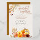 Agradecida invitación conjunta a la fiesta de compromiso con el Relieve metalizado de oro rosa de lujo - perfecto para otoño, temporada de calabaza y acción de gracias. El diseño acuático presenta hojas de otoño, flores y calabaza en colores cálidos de tierra. Fácil de editar para ocasión alternativa como aniversario de bodas, calentamiento de la casa, etc.