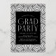 Simple invitación a una fiesta de graduación con la foto vertical del graduado con "Grad" exhibida en Relieve metalizado dorado con letras modernas de arte deco. Personalice la parte delantera de la invitación a la fiesta de graduación de Relieve metalizado de oro agregando el nombre del graduado, la escuela y el año de postgrado. La invitación se invierte para mostrar los detalles de tu fiesta de graduación con un fondo geométrico blanco y negro.