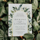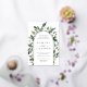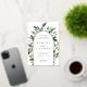 Nuestra invitación a la boda de White Peony rodea los detalles del día de la boda con un arco elegante de vegetación acuática pintada, follaje botánico y flores blancas de rosa y peonía. El guarnecido de Relieve metalizado dorado completa el diseño para un acabado de lujo.
