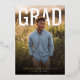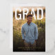 This modern graduation design features a clean, magazine-style layout with a full-bleed portrait photo on the front and bold, oversized “GRAD” typography for a confident, celebratory look. The soft natural background and warm lighting give the design a polished yet approachable feel, making it suitable for both high school and college graduates. On the back, the design transitions into a graduation announcement combined with a party invitation, including space for an additional photo and personalized event details. The overall aesthetic is timeless and versatile, perfect for sharing graduation news while inviting friends and family to celebrate this milestone.