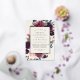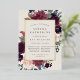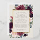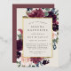 La invitación al mitzvah de murciélago floral de moda tiene un borde de morada de marsala, color púrpura rosa rubí y flores azules polvorientas, con frondosos follajes botánicos y vegetación y adornos de Relieve metalizado dorado. Personaliza con tu ceremonia de templo y detalles de celebración en letras modernas con un rico fondo blanco y marfil.