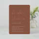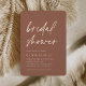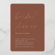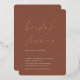 Invite a los huéspedes a celebrar a la novia con estas invitaciones modernas y mínimas a la ducha de novias con impresionantes acentos de Relieve metalizado de oro rosa. El diseño sencillo incluye "ducha de novia" en un guión casual escrito a mano sobre un fondo de roya de tonos cálidos de tierra, con los detalles de tu evento alineados en la parte inferior izquierda con letras modernas y blancas.