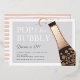 ¡Saca el champán! Las invitaciones para fiestas de cumpleaños para cumpleaños, fiestas de cumpleaños 21 o cualquier celebración de cumpleaños incluyen una botella de Relieve metalizado de oro negro y rosa con champán con las palabras "pop the bubbly" con letras blancas de moda. Personalice con los detalles de su fiesta debajo.