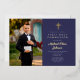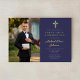 Invitación al Relieve metalizado de la primera comunión con guión de oro azul de la Marina personalizada.