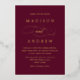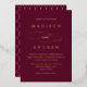 Simple y clásica invitación de boda con sus nombres y detalles bodas mostrados en letras de Relieve metalizado dorado con acentos caligráficos en un fondo burdeos. La invitación a la boda de Relieve metalizado dorado tiene un diseño de enrejado blanco y borgoña. El diseño se coordina con nuestra colección de bodas Amados.