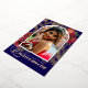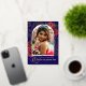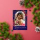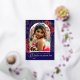 Esta invitación de Quinceañera incluye rosas rojas fijadas en un fondo azul marino con sutiles detalles de follaje de oro. Su foto está elegantemente encerrada en forma de arco, complementada con un sofisticado y moderno tipo de letra de caligrafía. La parte trasera de la invitación incluye el mismo diseño, mostrando una tiara princesa en tonos dorados.