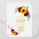 Invite a sus amigos y seres queridos con esta elegante invitación de recepción de boda con texto de lámina dorada de girasol y flores de rosa borgoña que ha sido diseñada para parejas que han elegido intercambiar votos en una ceremonia privada pero desean compartir la alegría de su reciente matrimonio.