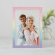 La foto está enmarcada por un delgado borde dorado, y toda la carta tiene un vibrante borde gradiente de arcoiris pastel, que pasa de rosa y amarillo en la parte superior a azul y púrpura en la parte inferior. El diseño general es elegante, moderno y festivo del amor LGBTQ+. Personalizar con su propia foto y texto personalizado en la parte posterior.