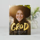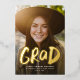 Esta invitación de graduación de una foto y la invitación a la fiesta presentan una foto vertical de marco completo con la palabra "grad" en negrita tipo broche en oro (u otro) Relieve metalizado. Esta elegante tarjeta también ofrece espacio para el nombre del graduado, la escuela y el año y cualquier otro detalle que desee compartir. La parte de atrás es un negro que coordina con confetti blanco y tiene espacio para todos los detalles de tu fiesta de graduación. Es una gran manera de celebrar una graduación y anunciar la noticia a amigos y familiares. Esta tarjeta fresca también coordina con los suministros y decoración fiestas de la colección Lea Delaveris Design Bold Graduate.