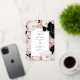 ¡Elegancia personificada! Esta invitación a la boda inspirada en Chanel es una obra de arte lujosamente adornada. El texto está adornado con opulentas flores rosadas, blancas con joyas y delicadas hojas de acento negro, creando una invitación que exuda estilo atemporal y sofisticación romántica. El cuadro y el logotipo cardiaco se presentan en Relieve metalizado rosa de oro.