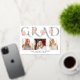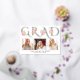 Invitación de graduación de fotografía de la tipografía GRAD de Relieve metalizado de oro real rosa. Presenta la palabra "GRAD" en una fuente decorativa en Relieve metalizado de oro rosa, ramos de rosas rosas rosas y tres fotos. El reverso presenta un patrón de tapones blancos de graduación en un rosa polvoriento.
