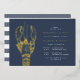 Sencillas pero impresionantes invitaciones a la cena con temática náutica cuentan con un intrincado y detallado ilustracion de langosta en un impresionante Relieve metalizado de oro sobre un fondo azul marino, con los detalles de tu evento alineados a la derecha. Los nombres de sus invitados o invitados de honor aparecen en Relieve metalizado dorado para un toque de moda.