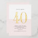 Invite a los invitados a su evento con esta invitación de personalizable de 40 años. Cuenta con un bloque de color rosa y blanco con una tipografía moderna. Personalice esta moderna invitación de 40 años añadiendo los detalles de su evento. Esta invitación de Relieve metalizado de oro para 40 años está disponible en otros colores de Relieve metalizado.