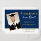 Relieve metalizado dorado de Invitación Grad 2025 - Marina Blanca. Un toque de clase con verdadero Relieve metalizado en oro para el encabezado en la parte superior, año y nombre de los graduados, y también bordeando la imagen y entre los dos colores del fondo con azul marino en la parte superior, y blanco en la parte inferior. Personalice fácilmente el texto en ambos lados y reemplace la imagen de ejemplo con la suya propia.